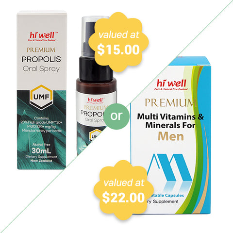OVER $200Hi Well Premium Propolis UMF 20+ MGO 830+ Oral Spray 30ml or Hi Well Multi Vitamins For Men 60 Capsules (Exp.01/2026)